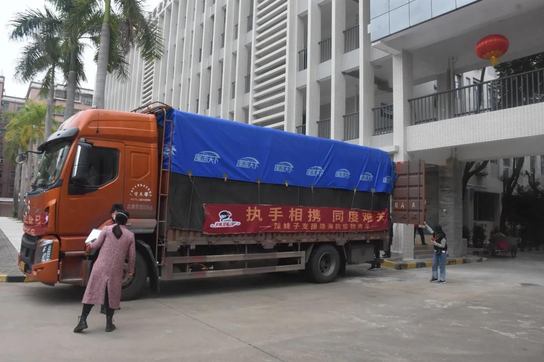 2022年1月17日17时28分,一辆满载食品的卡车从位于湖南邵阳的辣妹子食品股份有限公司洞口工厂缓缓驶出,车身上挂着“执手相携,同渡难关——辣妹子支援珠海抗疫物资车”的条幅。这台车将运送辣妹子公司捐赠给珠海南屏封控区和管控区的2000件八宝粥、拌饭酱等产品到珠海,支援珠海抗疫。
